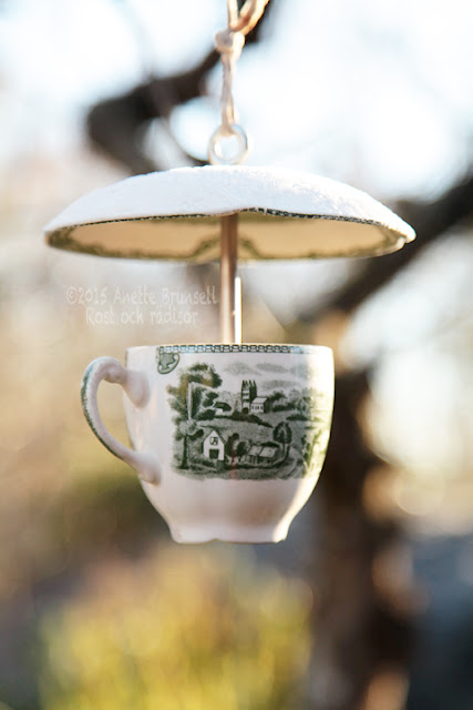 Fåglarna älskar de små kopprestaurangerna. I trädet ovanför sitter ett tiotal talgoxar och bearbetar sina solrosfrökärnor eller väntar på sin tur för inflygning. Det här snabbmatstället tar bara emot små kunder. Skator göre sig icke besvär.